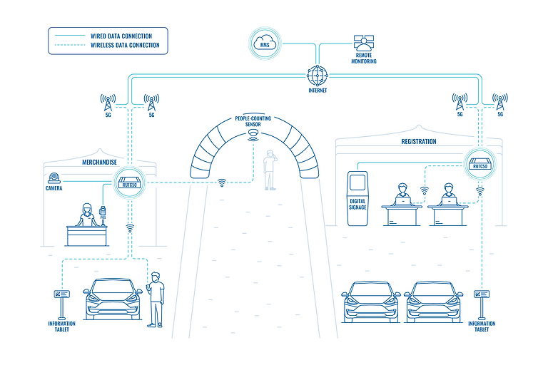 As capacidades de nossa avançada tecnologia de rede não se limitam às especificações técnicas, mas se validam através de implantações práticas. Um excelente exemplo é o uso de roteadores 5G RUTC50 em feiras automotivas temporárias, onde o desafio não é apenas fornecer conectividade, mas fazê-lo em uma escala que excederia as soluções convencionais.