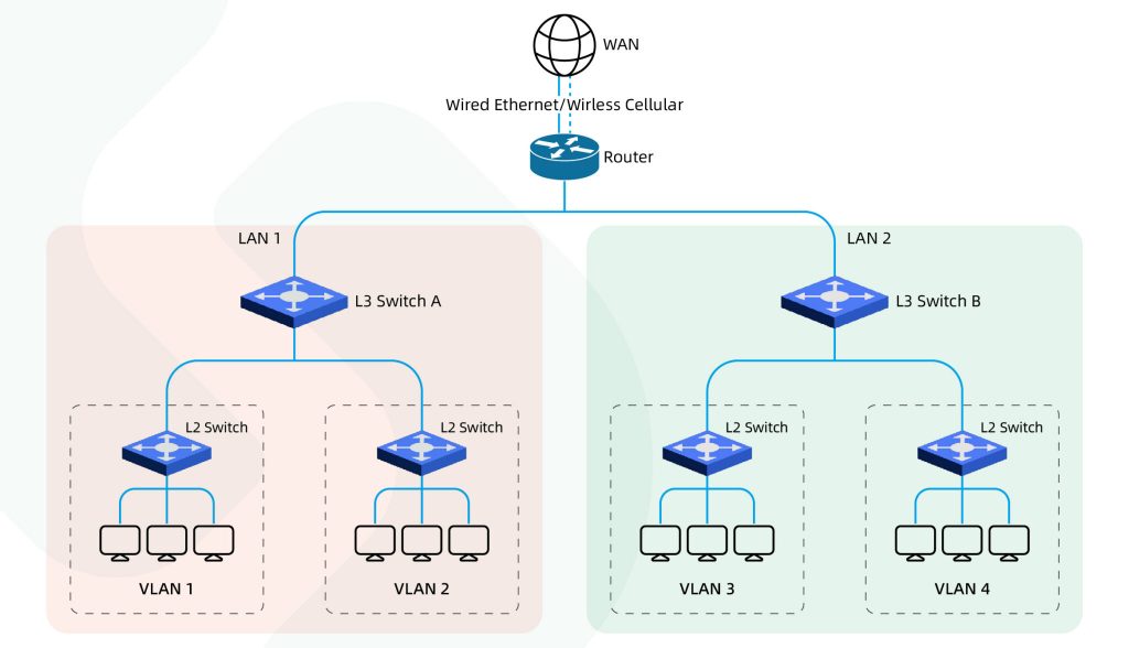 Por exemplo, no esquema a seguir, LAN1 e LAN2 poderiam representar diferentes andares ou departamentos em uma grande empresa, sites industriais e redes de monitoramento de escritório separadas, ou segmentos distintos em uma implementação IoT. Dentro dessas LANs, os switches de Camada 3 segmentam o tráfego em VLANs conforme a função, localização ou departamento, garantindo uma comunicação interna eficaz. O roteador é responsável por conectar essas LANs, permitindo a comunicação entre elas e oferecendo um gateway para redes externas.